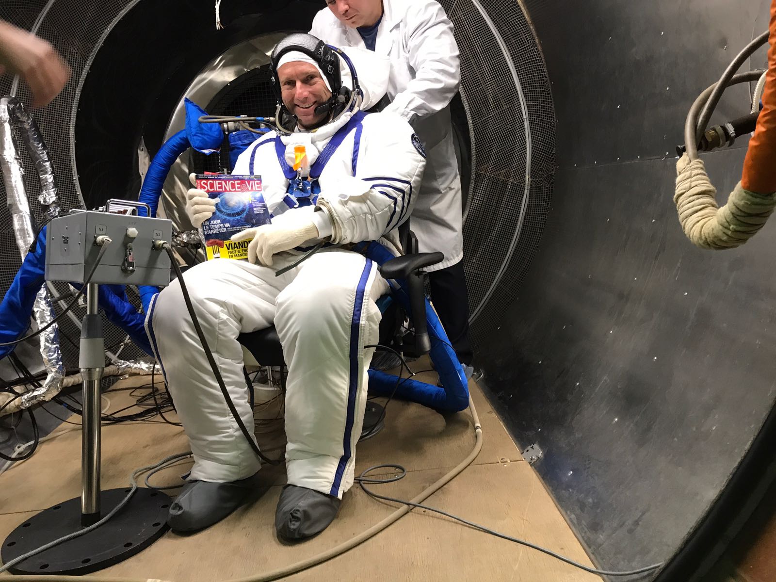 Alors que l’été et ses chaudes températures ont migré sous d’autres cieux dans l’hémisphère sud, la température reste toutefois élevée chez SolarStratos, notamment dans la combinaison spatiale que Raphaël est allé tester chez nos amis russes de Zvezda. En cette fin septembre, le but de cette nouvelle visite chez nos partenaires moscovites était de tester la combinaison dans une chambre dépressurisée. Fort heureusement, Raphaël n’a pas connu la même mésaventure que le pauvre capitaine Haddock, qui trouva une souris au fond de sa combinaison (pour ceux qui se souviennent du fameux album  de Tintin «Objectif Lune»)! Au-delà de quelques gouttes de transpiration, Raphaël a pu ainsi goûter aux effets qu’il ressentira dans le cockpit lors de son vol record.